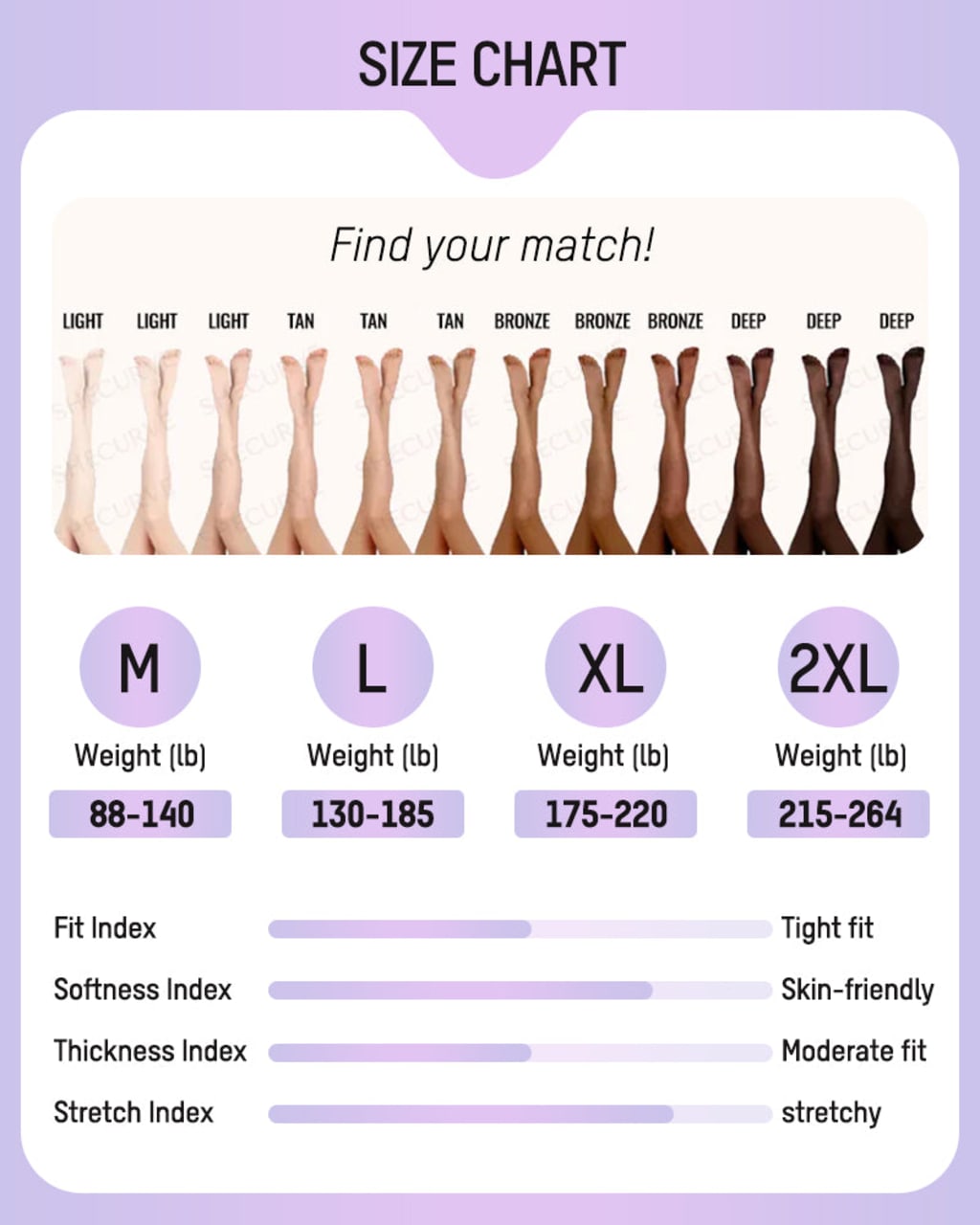 Stretch leggings come in sizes XS through XXL to suit every body shape. Refer to our size chart for the perfect fit.